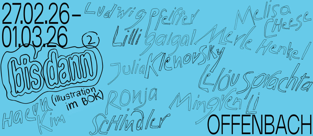 Zwei Gruppen an Illustrator*innen der Kunsthochschulen HfG Offenbach und BURG Giebichenstein Halle laden sich gegenseitig ein und zeigen den Stand der Dinge. Auftakt des Austauschs war eine erste Ausstellung im Raum für Grafik (Halle) im Oktober 2025. Gemeinsam wollen sie die Schüchternheit der oft introvertierten Praxis des Zeichnens überwinden und erneut die ganze Bandbreite aktueller Illustration präsentieren. Das Wiedersehen findet in der Galerie des BOK in Offenbach statt mit Melisa Cheese, Lilli Gaigal, Merle Henkel, Haeun Kim, Julia Klenovsky, Mingren Li, Ludwig Pfeiffer, Ronja Schindler, Lelóu Sprachta und endet mit einer Comic-Lesung am Sonntag, 1.3.2026 um 15 Uhr. Bis dann.